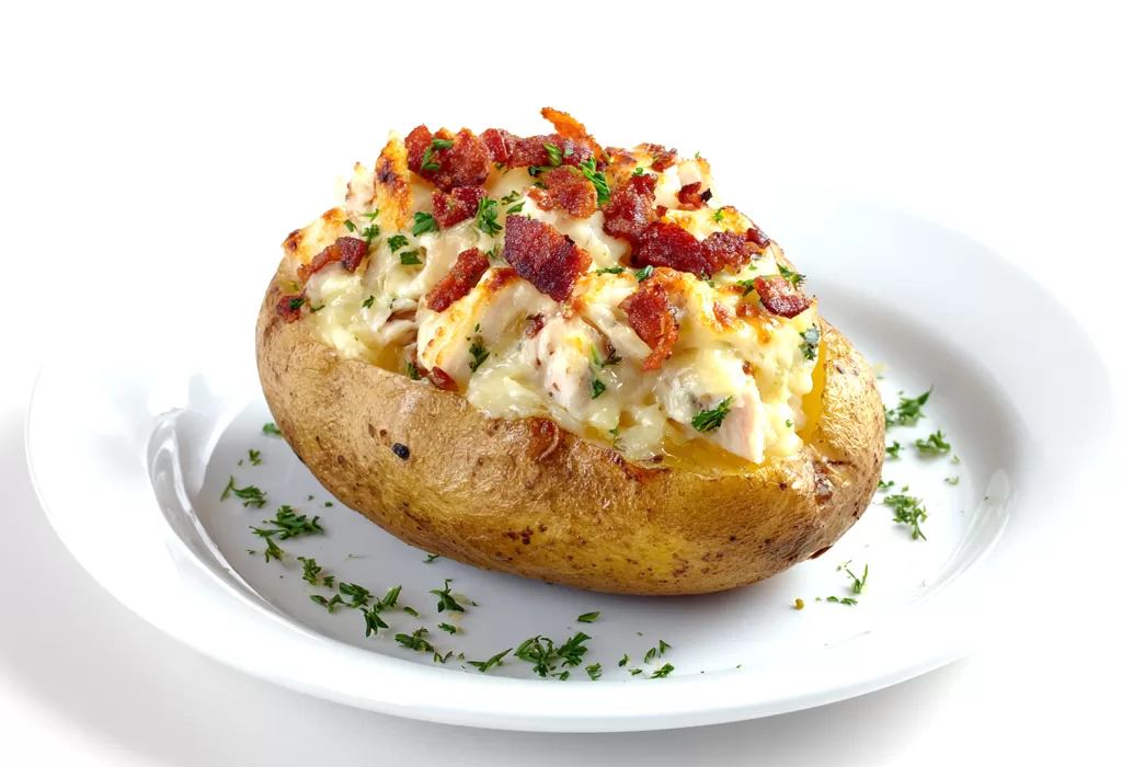 A hearty classic with a comforting twist. Our fluffy oven-baked potato is loaded with tender pieces of seasoned chicken and crispy smoked bacon, all brought together in a creamy sauce. Finished with a sprinkle of cheese and freshly cracked black pepper, it’s a wholesome dish that’s as satisfying as it is delicious. Perfect for when you want something filling, flavoursome, and straight from the heart of the kitchen.